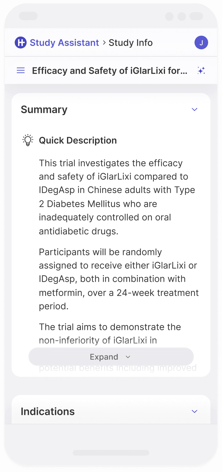 Quickly grasp trial details, from basics to intricate eligibility criteria, with unlimited, natural language questions.